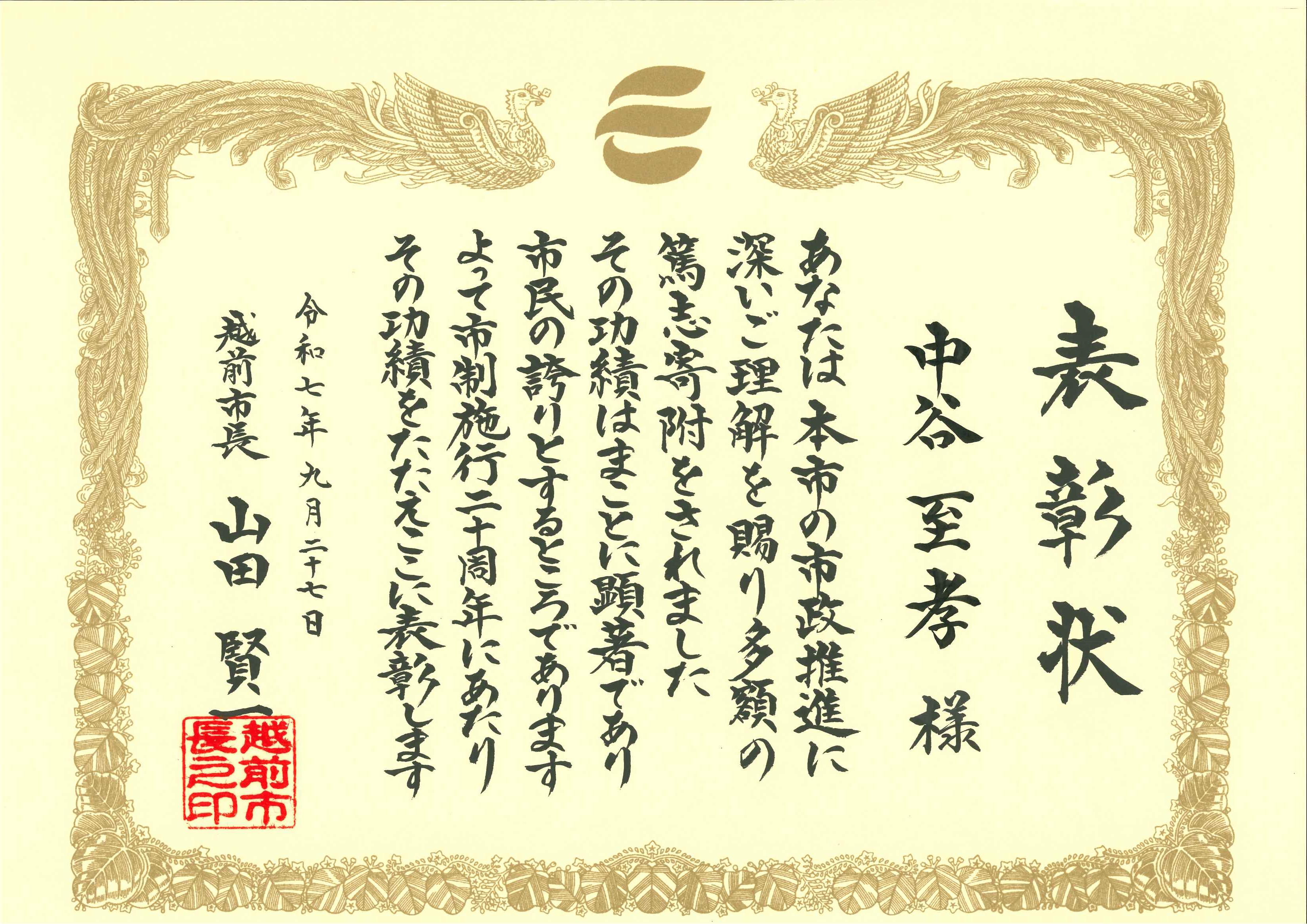 越前市長より表彰状をいただきました 2025年9月27日その他のお知らせ 弊社取締役会長の中谷至孝は越前市制施行20周年記念式典において、 市の産業振興と子育て支援に貢献したとして、越前市長より功労表彰を拝受しました。